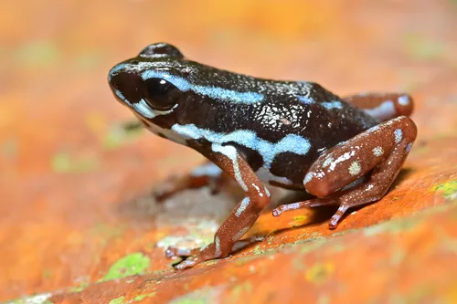 While most commonly bright red with blue limbs, these beautiful frogs can be green, yellow, blue, orange, or white with black mottling. Strawberry dart frogs actually have over 100 color variations. These frogs are the most toxic member of their genus; their skin secretes the poison, making them dangerous even to the touch. Their natural habitat ranges through Nicaragua, Costa Rica, and Panama. The high toxicity of their skin actually comes from eating specific species of ants and mites, meaning captive-bred frogs are completely harmless. Strawberry dart frogs have a unique parental care pattern; males guard the fertilized eggs, and females carry the tadpoles on her back to a nearby water source. Making a home among the leaf litter, the frogs are mostly active during the day and climb trees for safety. The IUCN lists them as least concern though they are threatened by habitat loss, pesticides, and exotic pet trades.